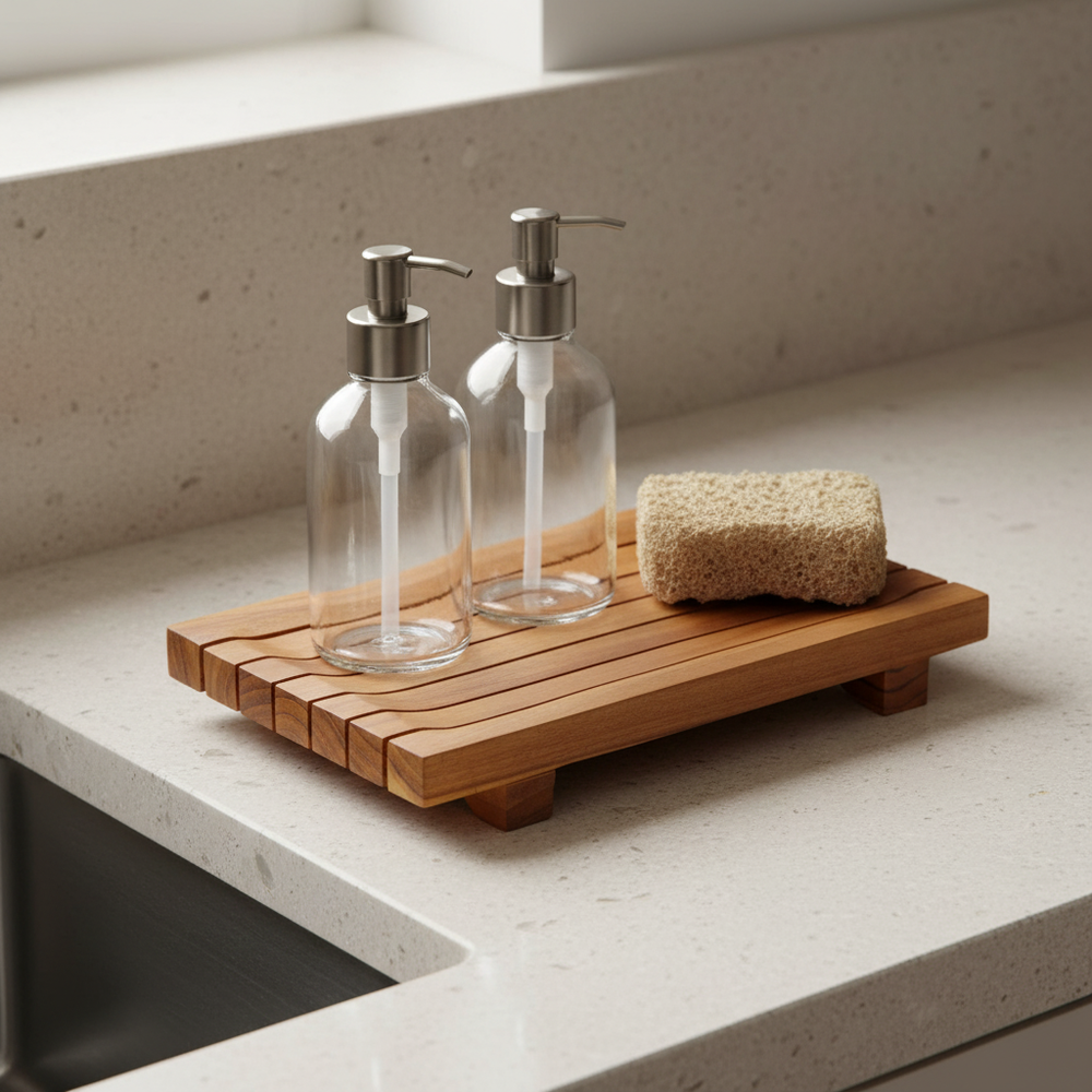 UNIQUE STYLE, CARVED BY CRAFTSMEN: Handcrafted from premium Javanese teak wood by master Indonesian artisans, this slotted soap dish tray combines functional elegance with sustainable craftsmanship. The integrated drainage design keeps soap and bottles dry between uses, extending its life while adding refined beauty to any bathroom or kitchen. Each piece reflects our commitment to heirloom-quality homeware that endures.